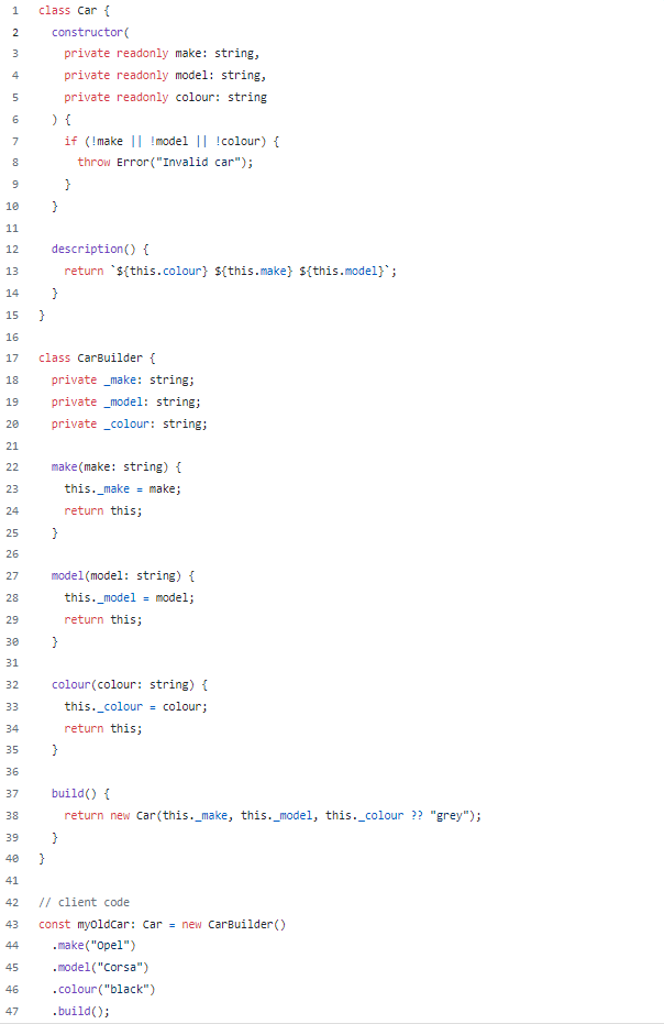 The builder pattern is a creational pattern that is supposed to help us build complex objects by breaking up the creation into steps. Example code that uses this pattern to create a Car instance could look something like the following.