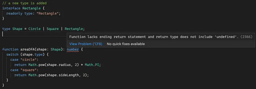 Even if we did not specify the return type of our function explicitly, we could still detect the missing branches as long as we had the noImplicitReturns config flag enabled when compiling TypeScript.