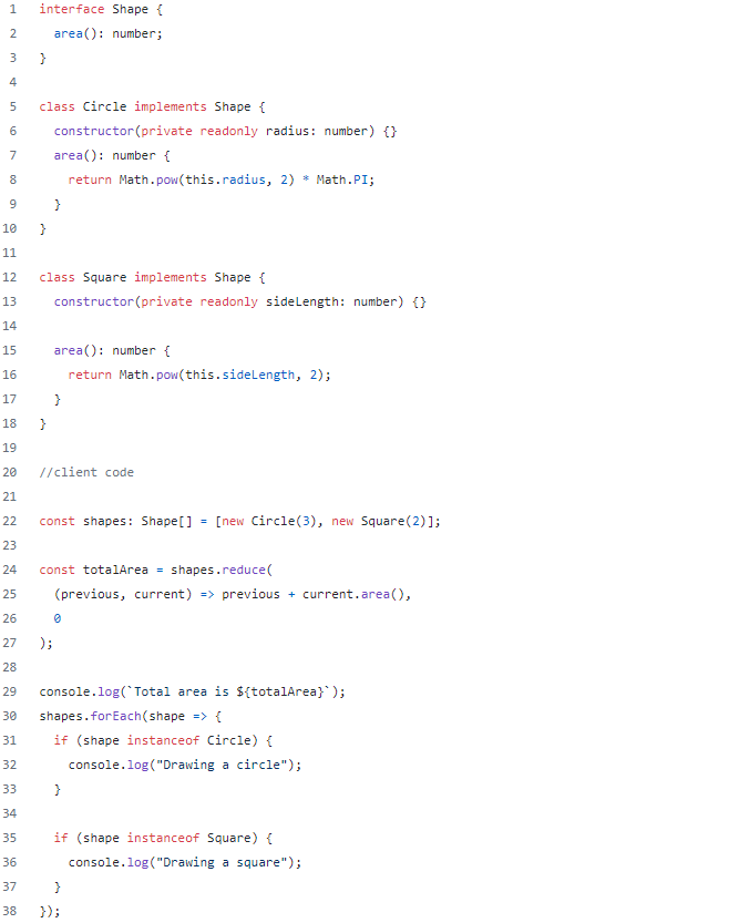 While this solves the single responsibility issue, it introduces a new one. To introduce a new Shape we would now need to go through all of the code and find all places where such distinction was being done and add a new if statement. The compiler would not be able to help us with this task. This breaks the open-closed principle.