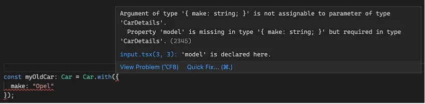There are a couple of things that I would not be happy about when I would have to work with code like that. First of all, it is quite verbose for the thing it is trying to achieve. Secondly, there are some optional and some required properties that the client code needs to provide in order to get a Car instance, but the compiler cannot help us distinguish which are which. The only way to notice that the make and model properties are required is to run the code and see the error in runtime.