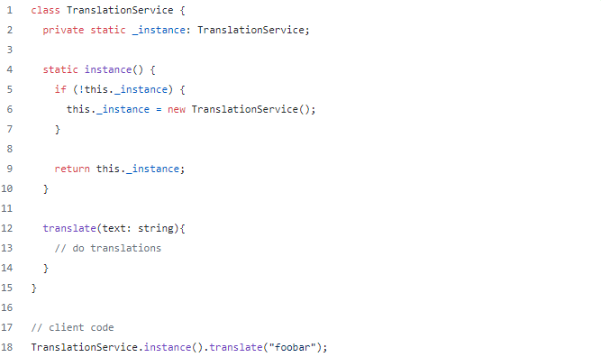 In our simplistic example, the singleton is used just to expose a single method and does not need to hold any state. Since TypeScript is a superset of JavaScript and functions do not need to be a part of a class here all of that could possibly be replaced with just the following.