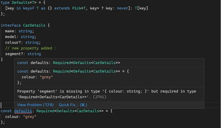 If we wanted to be a little fancier (and were using at least TypeScript 4.1) we could construct a type for our defaults. That way, the compiler could warn us when there are new properties added to our CarDetails type that do not have any defaults set. Here is how it could look like: