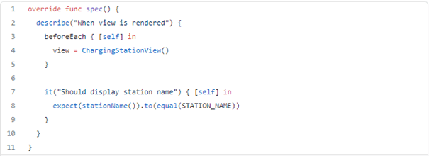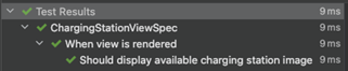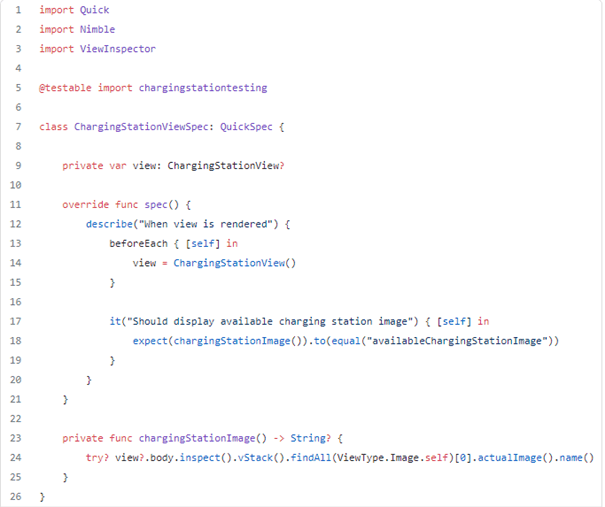 To achieve the goal we are defining ChargingStationView?. The view might be empty because we are going to instantiate it afterward in the beforeEach section, just to have a new fresh instantiation for each test case. Eventually, we create well-described expectations. Seeking view element logic is moved to the private function chargingStationImage() because of two reasons. First, the expectation is more verbose, and second, it allows us to map the outcome from ViewInspector into an optional String value that contains the name of the image. That move helps check if the image is visible.