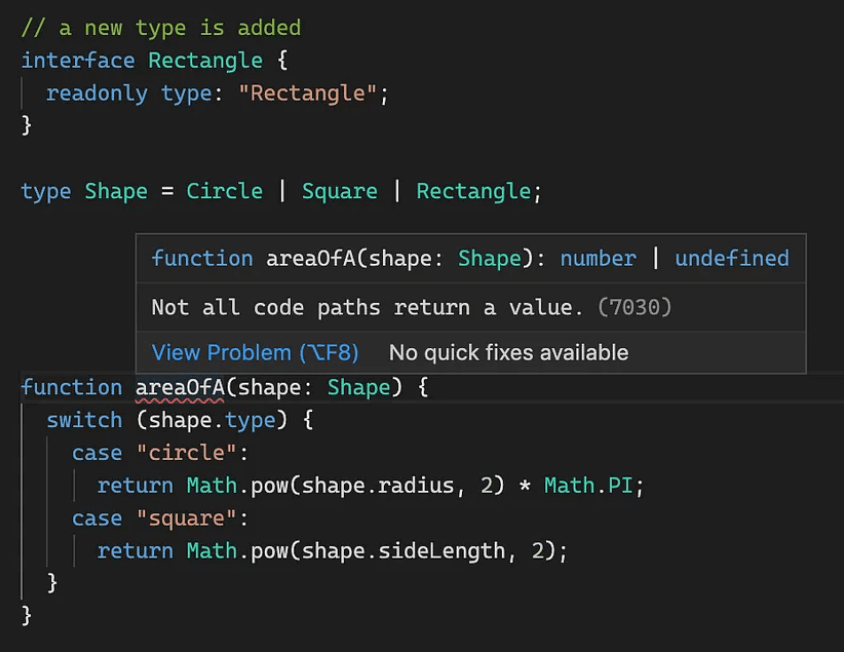 Even if we did not specify the return type of our function explicitly, we could still detect the missing branches as long as we had the noImplicitReturns config flag enabled when compiling TypeScript.