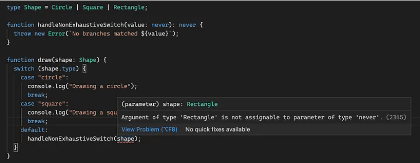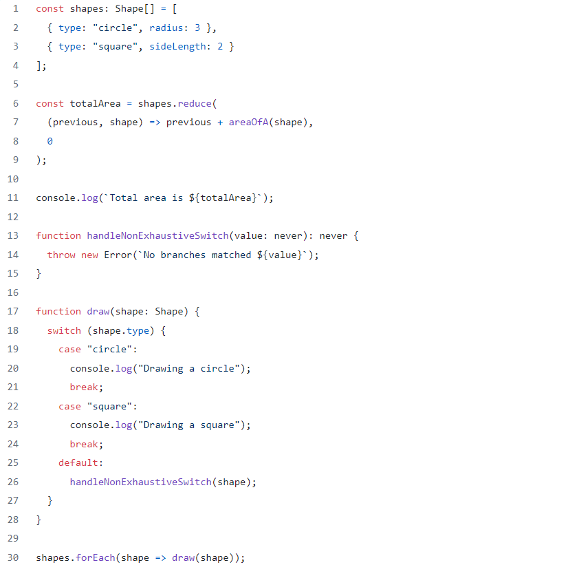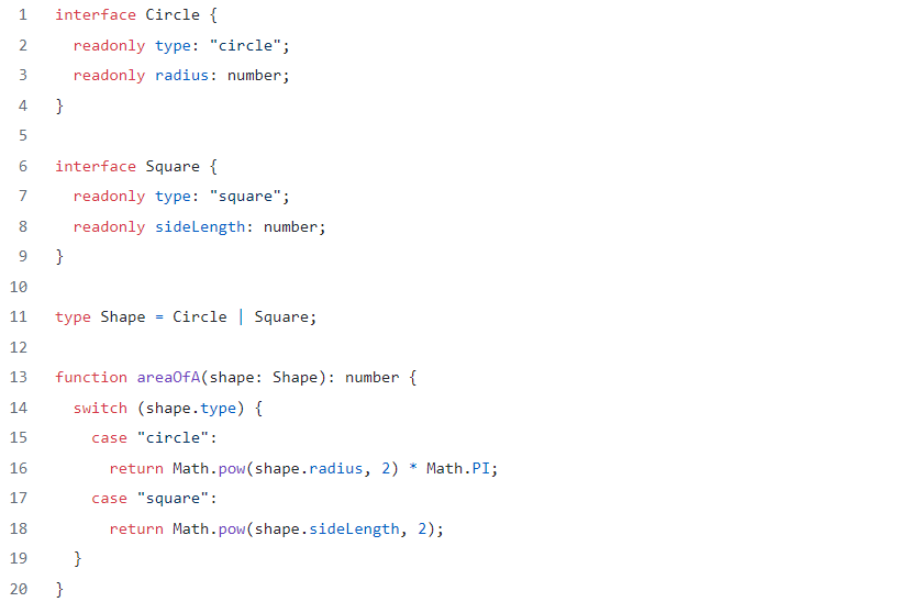 Since the type property of our shapes can only have two possible values, the compiler can know which type of object will be used in which branch. That is why we can safely access the properties of the shape in each of them. The compiler could also warn us if there would be a new shape added later on and the switch statement would not be updated.