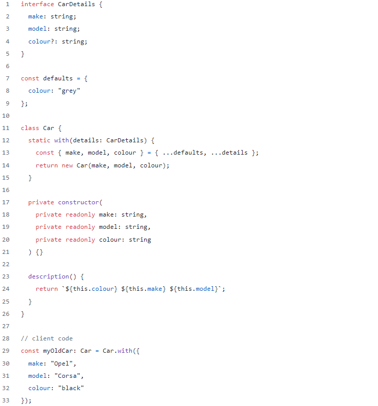 There are a couple of things that I would not be happy about when I would have to work with code like that. First of all, it is quite verbose for the thing it is trying to achieve. Secondly, there are some optional and some required properties that the client code needs to provide in order to get a Car instance, but the compiler cannot help us distinguish which are which. The only way to notice that the make and model properties are required is to run the code and see the error in runtime.
