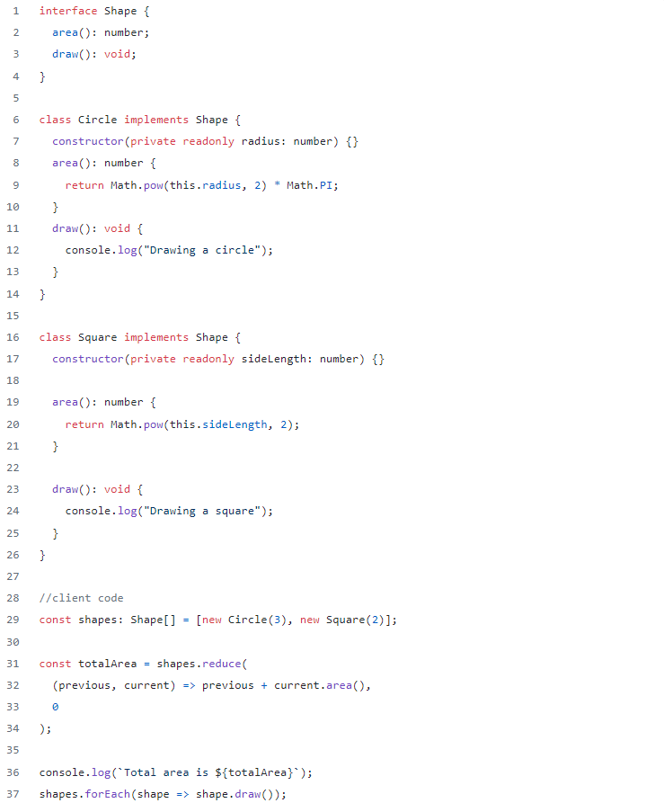 While this solves the single responsibility issue, it introduces a new one. To introduce a new Shape we would now need to go through all of the code and find all places where such distinction was being done and add a new if statement. The compiler would not be able to help us with this task. This breaks the open-closed principle.