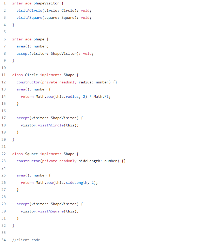 One big drawback is that the solution is quite complex and verbose. The visitor pattern also seems to be not as popular as other patterns I mentioned before. If someone comes across it the first time, it might be challenging to get what is going on. An alternative coming from the functional languages could be to use pattern matching. Unfortunately, Typescript does not include it natively. We can quite nicely simulate it using discriminated union types, though.